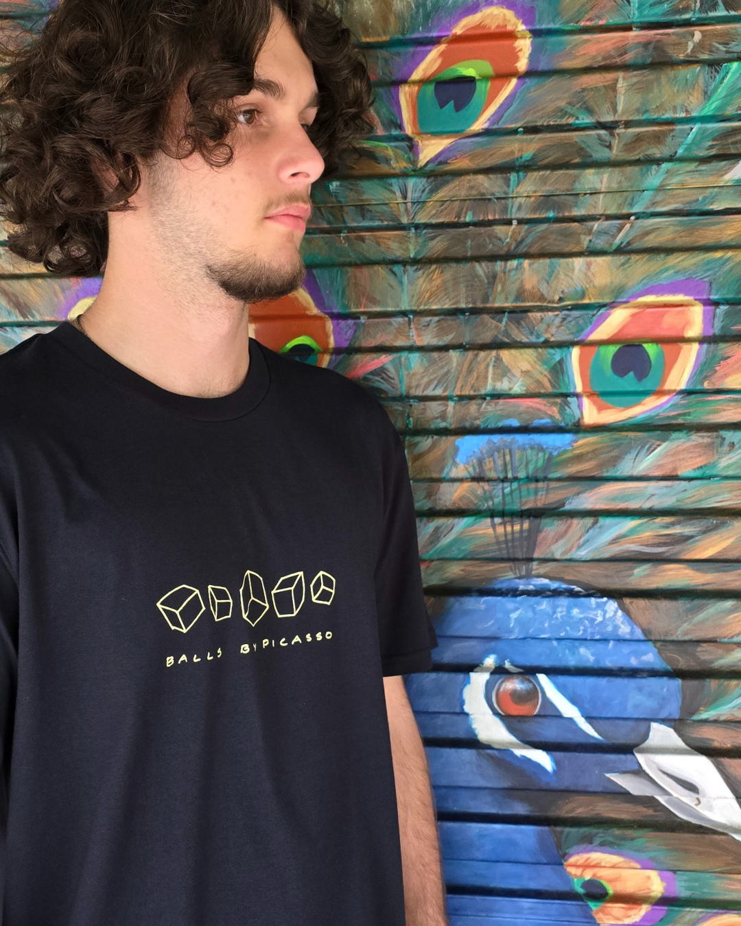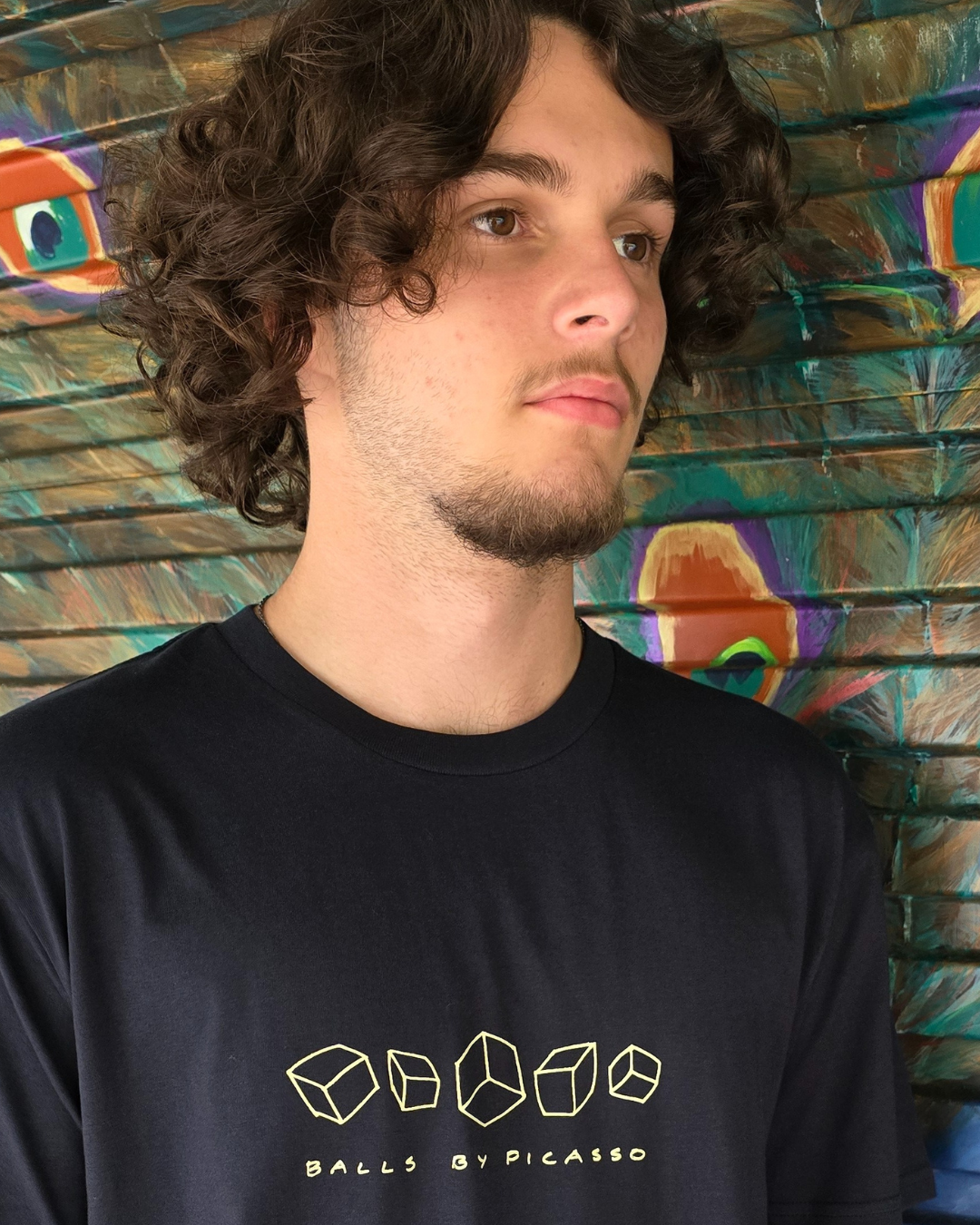 Art you can wear. Abstraction "Balls By Picasso" is timeless. Made from high-quality cotton, this t-shirt features a beautiful screen-printed old tree drawing, adding a touch of natural beauty to your wardrobe. Handcrafted in Nimbin by a talented Australian artist, this t-shirt is the perfect addition to any nature lover's collection.