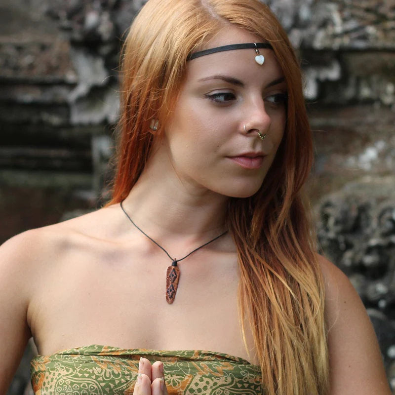 Materials include Sandalwood, Rosewood, Buffalo Horn and Buffalo Bone. All sustainably farmed and fair traded. The patterns within the necklaces comprise of either black wood resin or bone resin. Cord is made from 1mm waxed cotton.