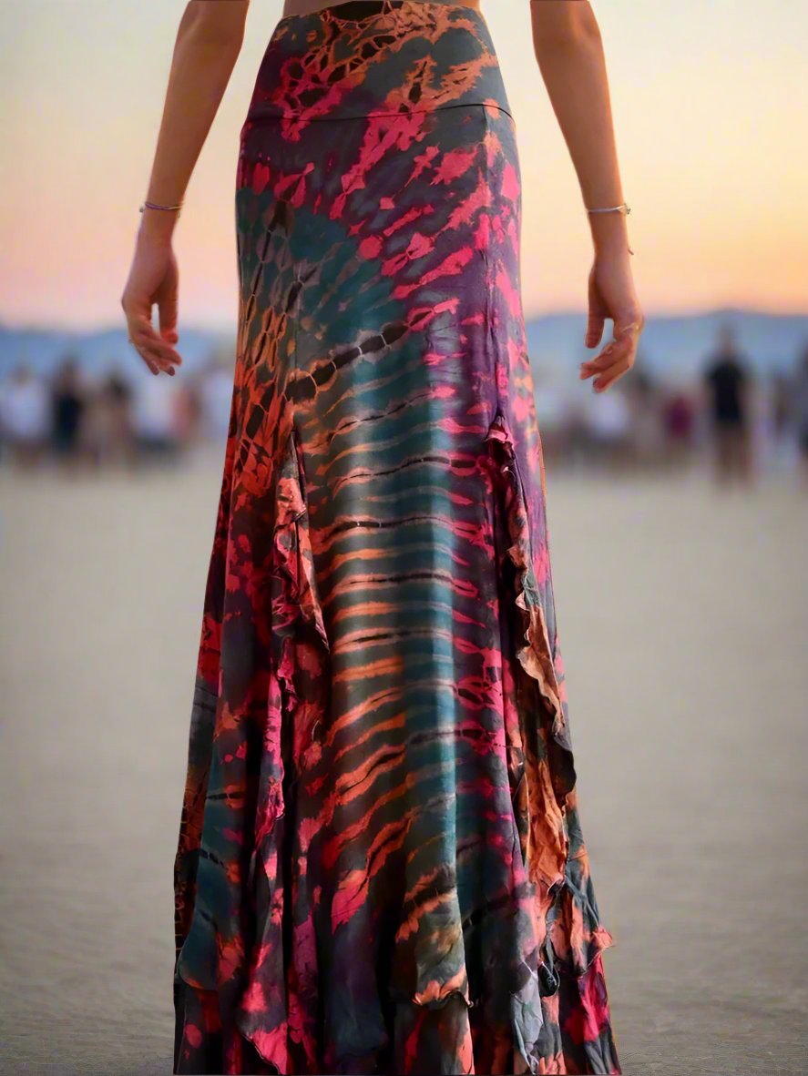 Experience the thrill of movement with the LaLa Ruffle Skirt! This dynamic skirt fits sizes 8-14 and features a stunning ruffle bottom with 2 high splits in the front and 2 lower in the back. The perfect addition to your dance wardrobe, the weighted bottom adds a new level of energy as you kick and twirl. Get ready to turn heads and make a statement with every step!