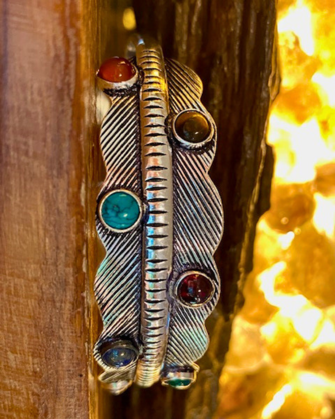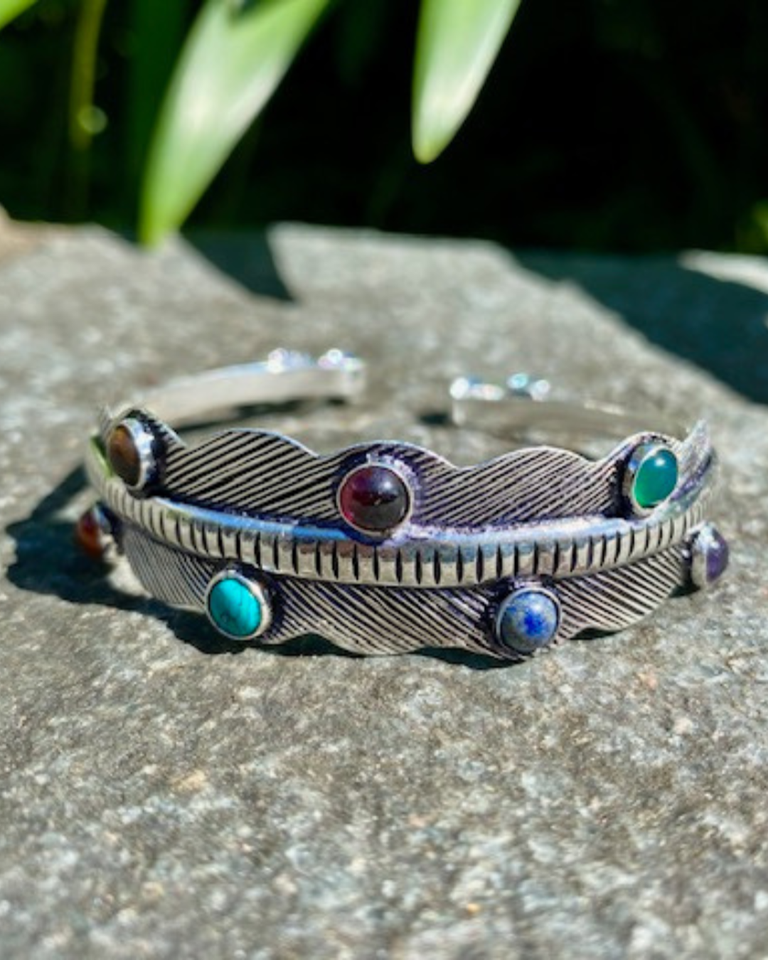 This one is silver plated brass, with the adorning stones: Amethyst, Jade, Lapis Lazuli, Garnet, Turquoise, Tiger Eye, Carnelian.