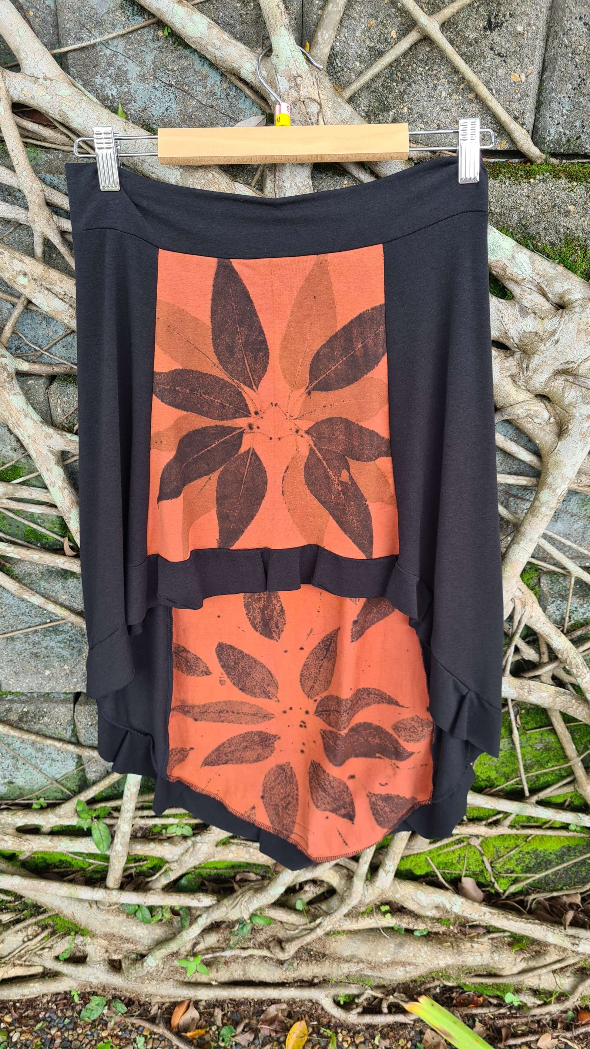 Shan-Dia is a super talented local artist who has mastered the art of eco-dying! Ecodying is a wonderful technique which transfers the colour and shape of a plant onto fabric. Shan-Dia eco-dyes onto fabrics which are made from 70% bamboo, 20% organic cotton and 10% spandex. The Sassy skirt has a waterfall effect design where it is shorter at the front and longer at the back. Due to the magical nature of eco-dying, each skirt created is completely unique from the next.